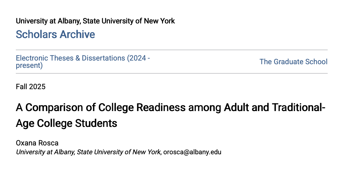 A Comparison of College Readiness among Adult and Traditional-Age College Students Author: Oxana Rosca Abstract This dissertation provides a comprehensive validity investigation of the DAACS Reading and Mathematics assessments to ensure that college readiness comparisons between adult learners (age 24+) and traditional-age students rest on psychometrically sound measurement. Accordingly, the dissertation emphasized the collection of internal structure validity evidence for DAACS mathematics and reading assessments. The internal structure of the DAACS Reading Assessment was examined using confirmatory factor analysis and bifactor twoparameter logistic (2PL) item response theory (IRT) models to distinguish a general reading comprehension factor from passagespecific residual factors.
